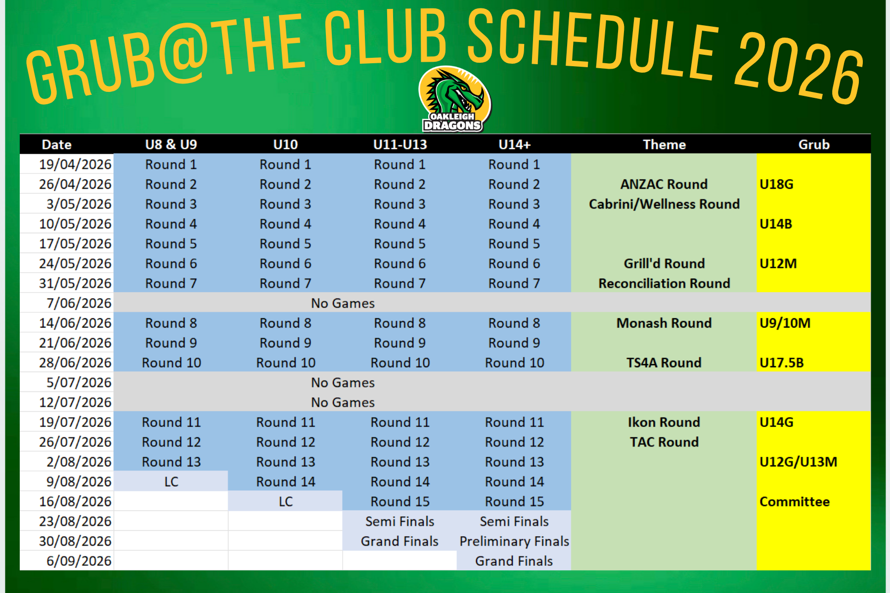 Grub at the Club is a social event held on Sunday evenings at Scammell to continue to foster our amazing Club spirit. Host teams provide meals for all Club members, and match day reports for all teams are presented. Grub nights are held approx. every two weeks, depending on match schedules. Your Team Manager will remind you when your team is rostered on. All host team members are required to assist with meal preparation, serving and cleaning up. We strongly encourage players from the older age groups to be involved.